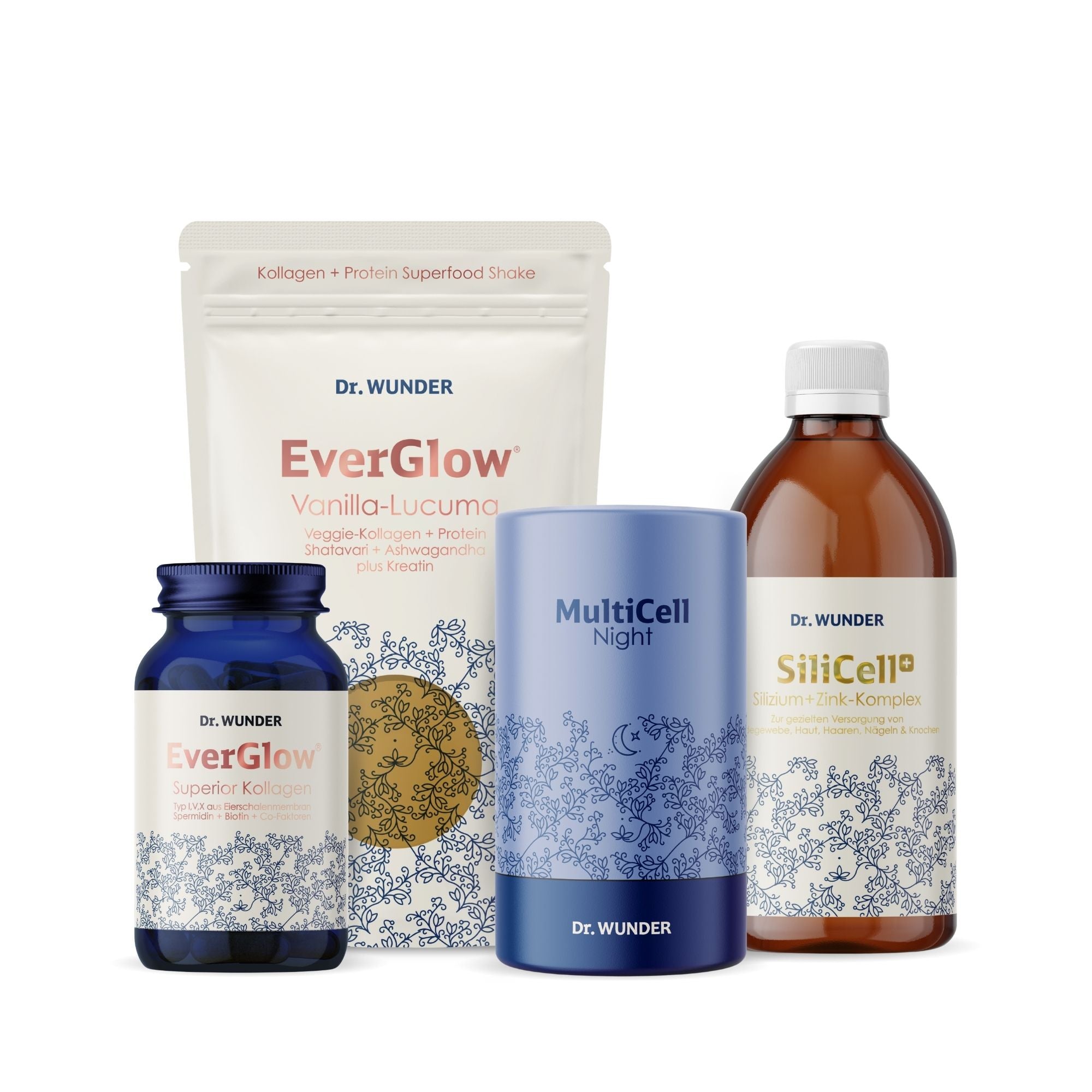 Dr. Wunder Beautiful Aging Intensiv-Kur – EverGlow Kapseln und Shake, MultiCell Night Dose, SiliCell Flasche