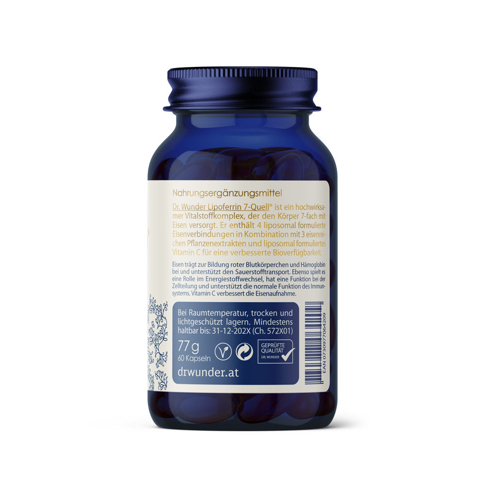 Unsere 7Quell LipoFerrin-Formula versorgt dich auf siebenfache Weise mit Eisen. Die innovative Kombination aus vier organischen Eisenverbindungen und drei eisenreichen Pflanzenextrakten – Curryblatt, Aronia und Aspergillus oryzae – bietet dir eine effektive und vielseitige Eisenversorgung. Ergänzt durch gepuffertes Vitamin C wird die Eisenaufnahme zusätzlich verbessert.