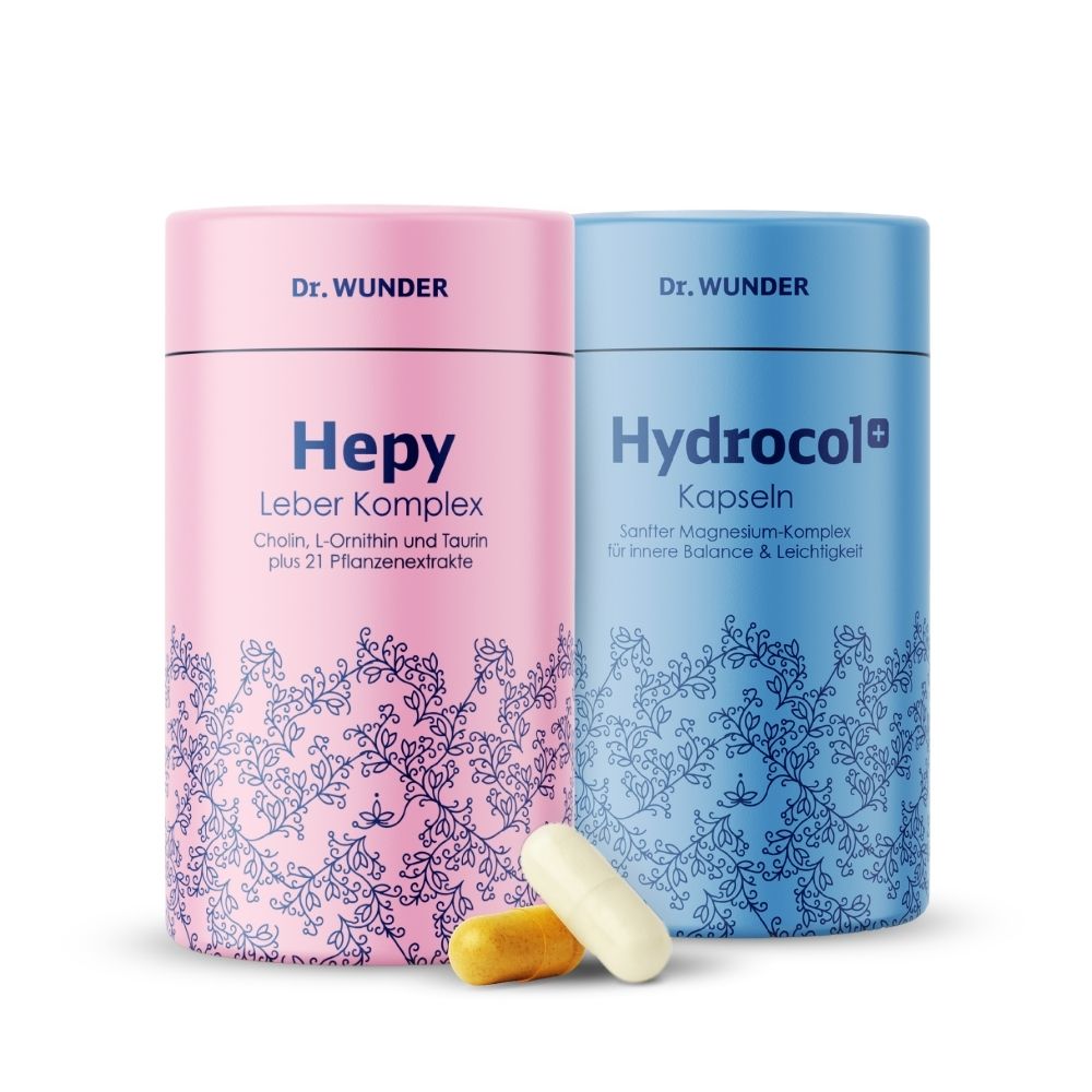 Die Bauchwohlkur ist eine effektive Kombination, die dein Bauchgefühl wieder ins Lot bringen kann. Hydrocol kann mit seinen speziellen Magnesiumverbindungen auf natürliche Weise die Darmfunktion fördern. Es ist einfach anwendbar und fügt sich nahtlos in deinen Alltag ein. Hepy Leber-Komplex, ein wohltuender Kräuterkomplex in Kapselform oder unser Hepy Bitter in Tropfenform, harmonisieren die Verdauung und können zudem helfen, den Appetit auf Süßes zu regulieren. Diese wohltuenden Kapseln sind flexibel einsetzbar und passen sich ideal deinem Tagesrhythmus an.